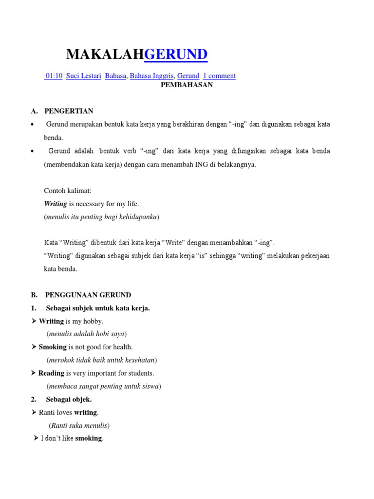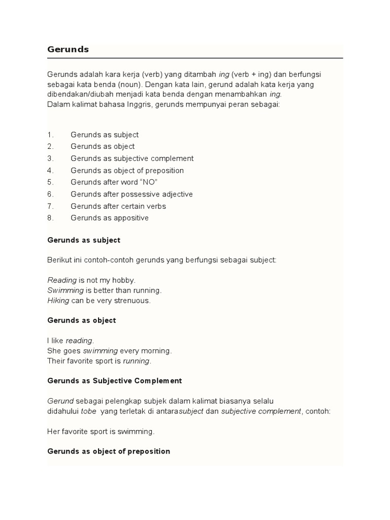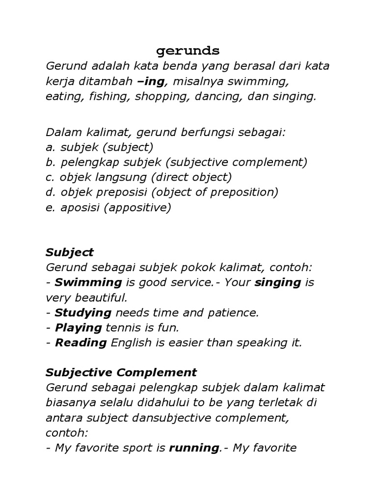 Berikut merupakan contoh kalimat gerund sebagai kalimat subject complement. Kalau kamu nggak ngerti tentang kata kerja dan kata benda, tambah puyeng deh dengan materi ini. Singing, drinking, running, walking, studying, dan lain sebagainya. Mempelajari gerund artinya juga mempelajari kata kerja, karena gerund adalah kata kerja yang berubah fungsi menjadi kata benda. Di buku sumber yang lain pun mengatakan hal yang kurang lebih sama.